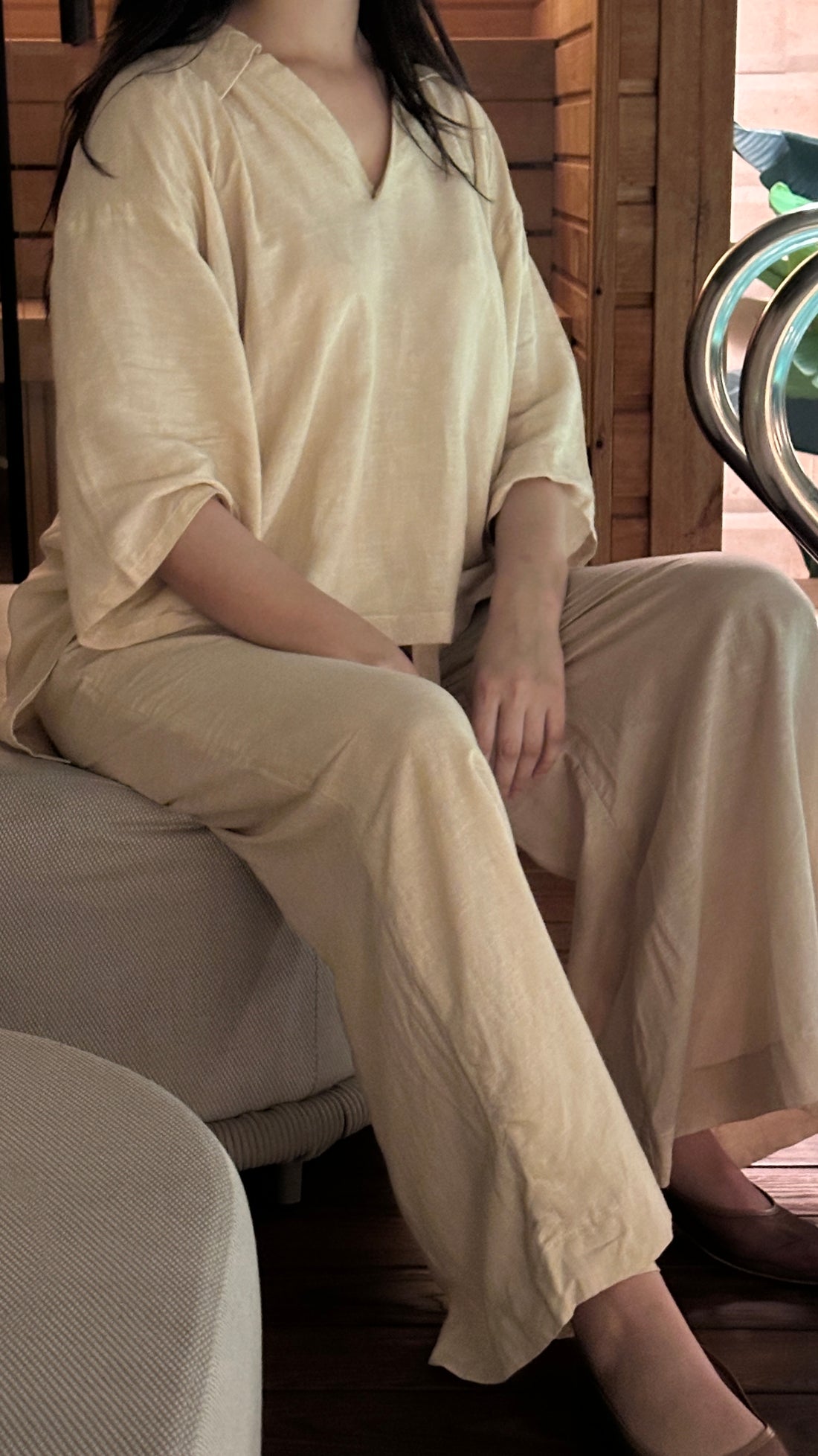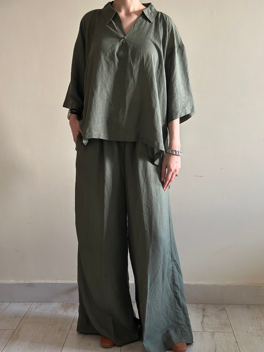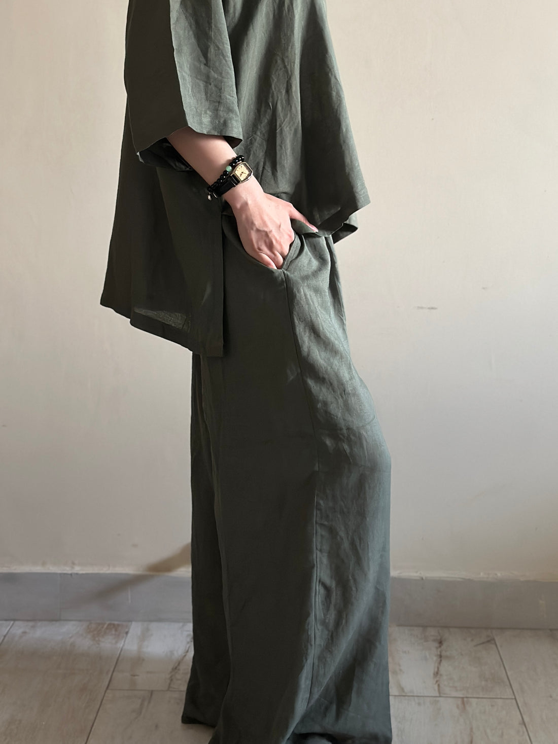 A breathable linen co-ord in earthy olive, blending effortless comfort with timeless style.