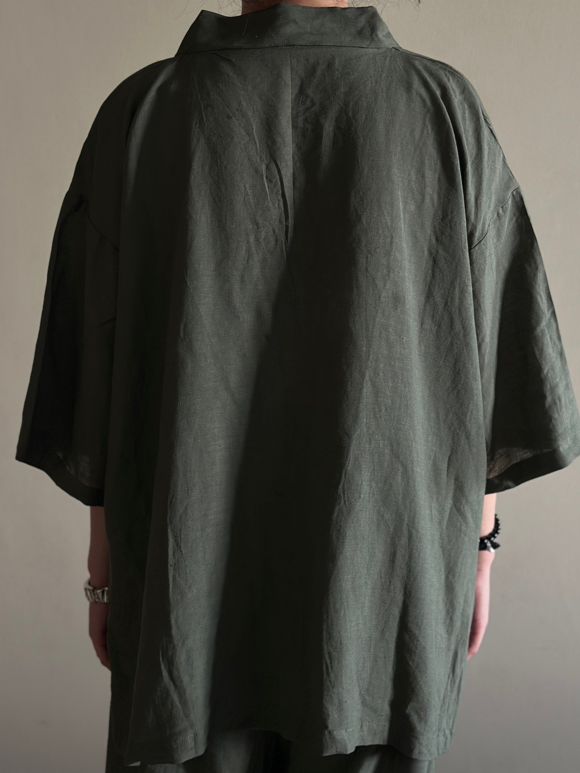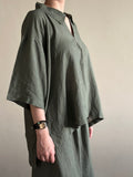A relaxed-fit linen shirt in a soothing olive shade, designed with a soft collar, half-button placket, and dropped shoulders. Its airy silhouette makes it perfect for layering or wearing solo, offering effortless style and all-day comfort.
