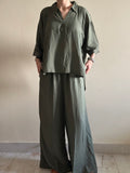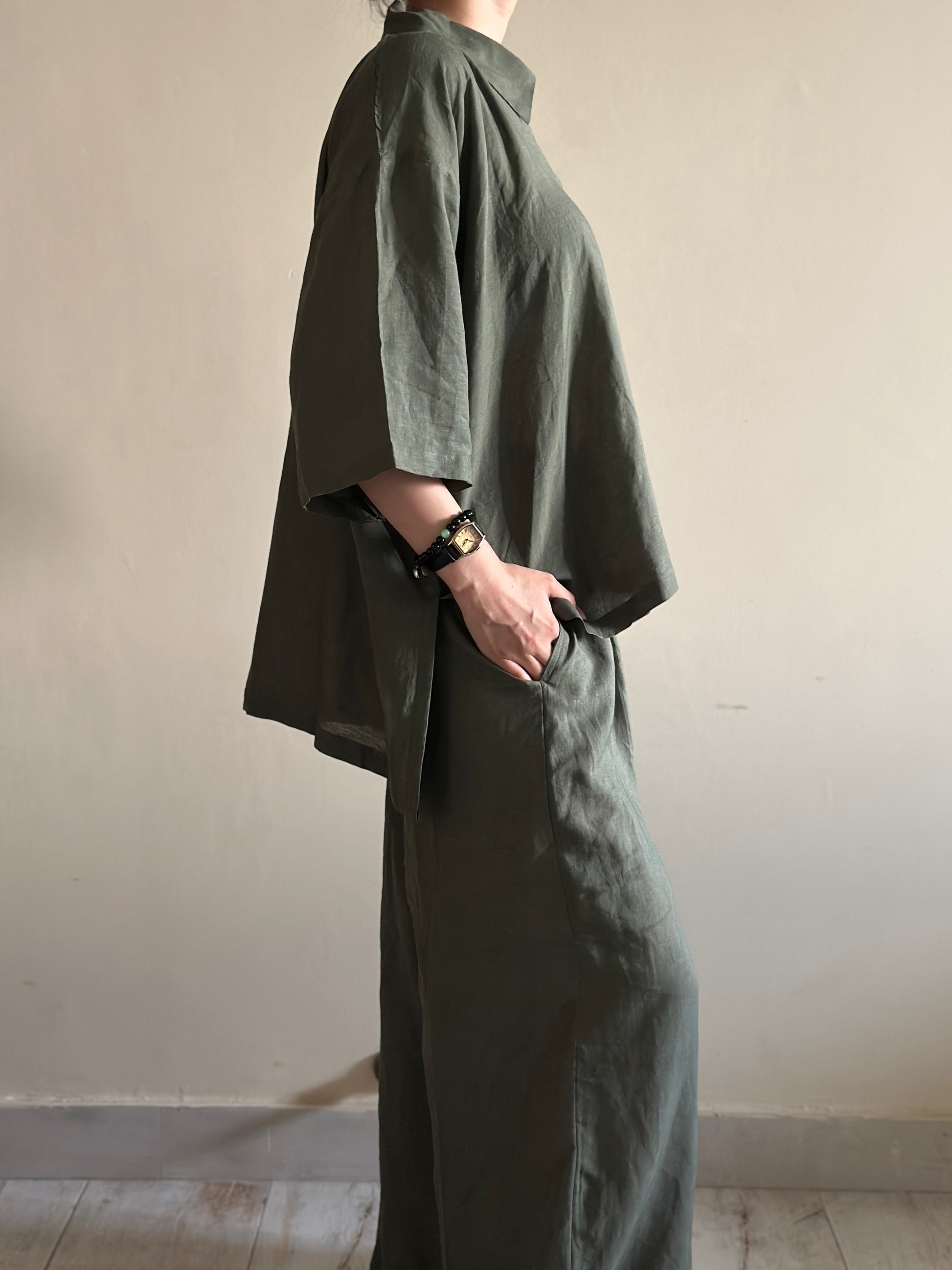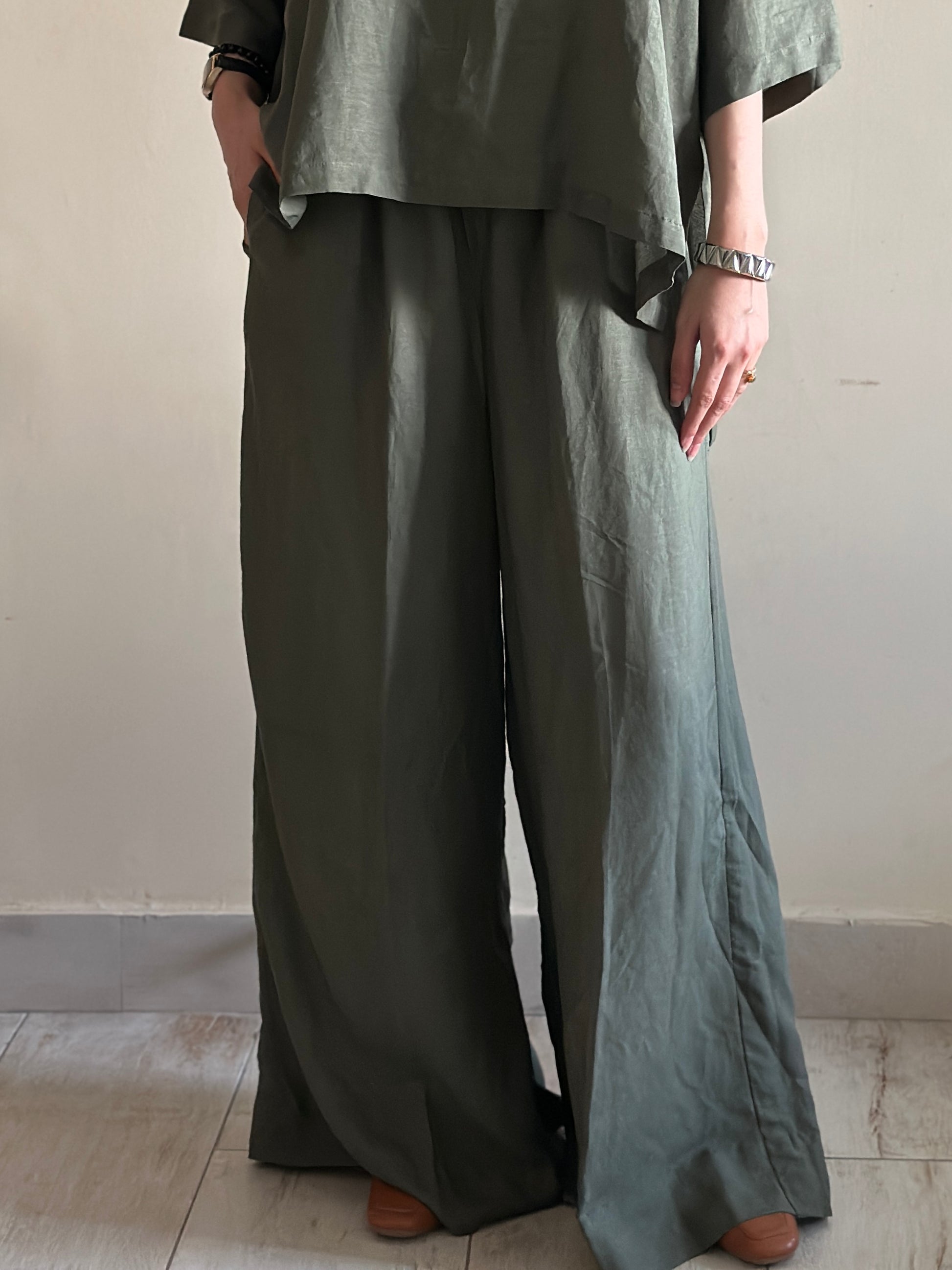 A breathable linen co-ord in earthy olive, blending effortless comfort with timeless style.
